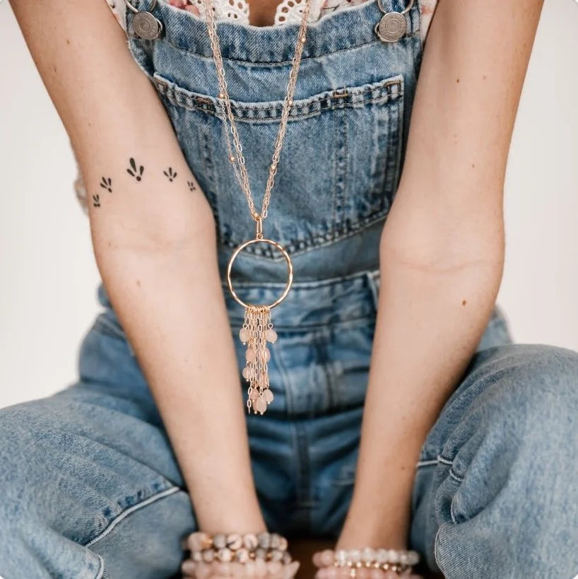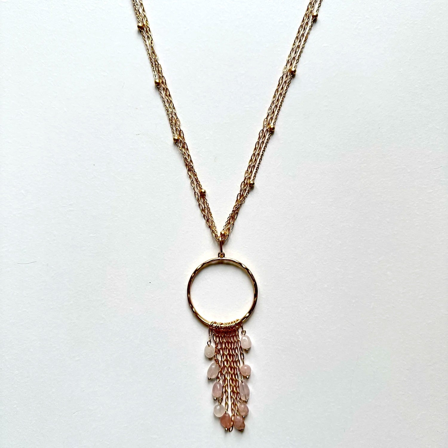 Say hello to our stunning Aura Pendant featuring delicate rose quartz pieces elegantly cascading from a chain tassel. This piece exudes elegance and charm, perfect for adding a touch of femininity to any outfit. Each rose quartz piece is carefully selected for its beauty and energy, making this pendant not only a beautiful accessory but also a meaningful addition to your jewelry collection.
